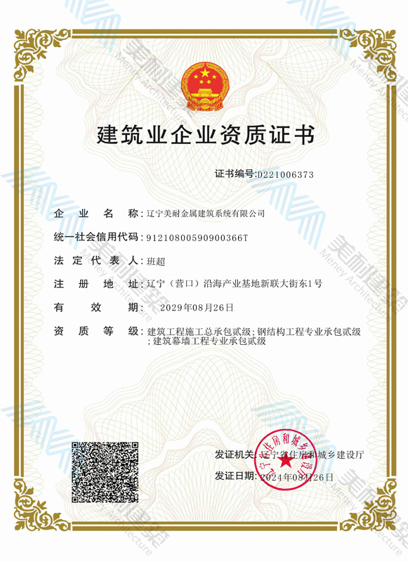 遼寧美耐金屬建筑系統(tǒng)有限公司位于遼寧(營(yíng)口)沿海產(chǎn)業(yè)基地,專(zhuān)注于預(yù)制金屬建筑系統(tǒng)領(lǐng)域,是一家集工業(yè)建筑設(shè)計(jì)、制作、施工及相關(guān)的技術(shù)咨詢(xún)與服務(wù)為一體的綜合性服務(wù)企業(yè)。作為國(guó)家鋼結(jié)構(gòu)協(xié)會(huì)會(huì)員、中國(guó)建筑金屬結(jié)構(gòu)協(xié)會(huì)會(huì)員單位與國(guó)家高新技術(shù)企業(yè),美耐建筑集建筑工程施工總承包、鋼結(jié)構(gòu)工程專(zhuān)業(yè)承包等多種資質(zhì)于一身,并擁有22項(xiàng)鋼結(jié)構(gòu)建筑領(lǐng)域?qū)@?項(xiàng)軟件著作權(quán)。